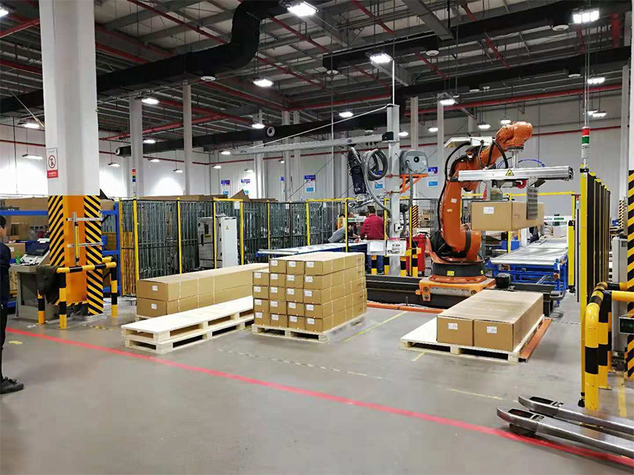 通過夾具的柔性化設計,PLC與MES數據交互等技術;使得柔性機器手應用得以實現。設備可根據產品條碼信息自動選擇托盤類型進行碼垛,并可實現續碼。該設備兼容200多種產品,在線可實現6種產品同時生產。